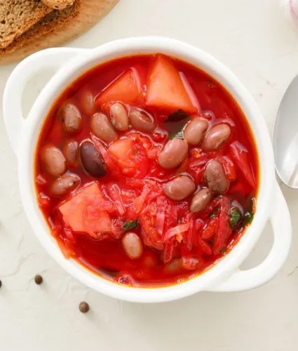 Постный Борщ с фасолью — это сытное и полезное блюдо, приготовленное на основе свежих овощей и натуральных ингредиентов. Он идеально подходит для вегетарианцев и тех, кто придерживается поста, обеспечивая богатый вкус и питательные вещества. Борщ содержит фасоль, что делает его отличным источником растительного белка.